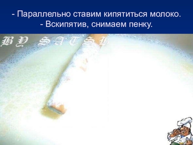 Слайд 6- Параллельно ставим кипятиться молоко. - Вскипятив, снимаем пенку.