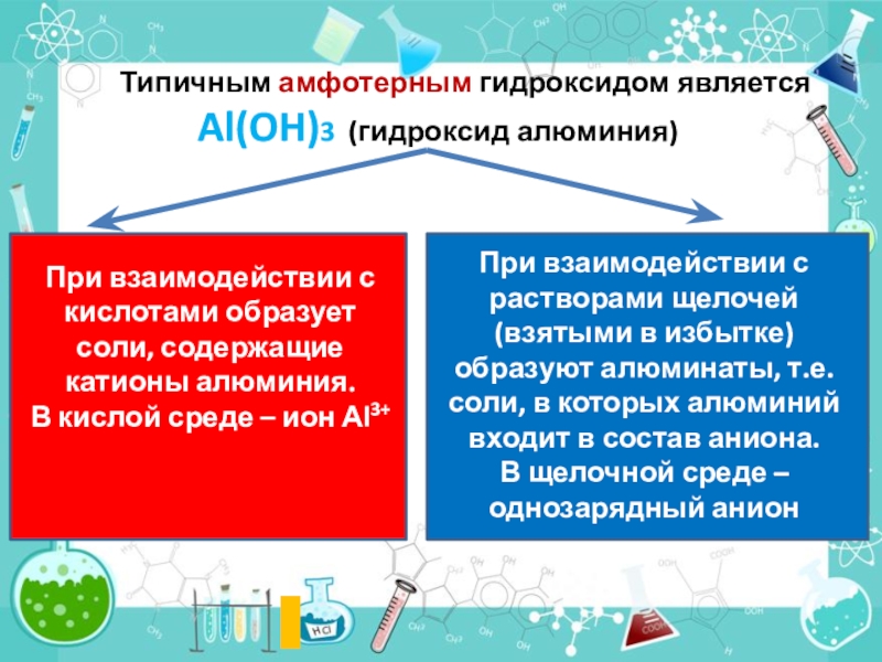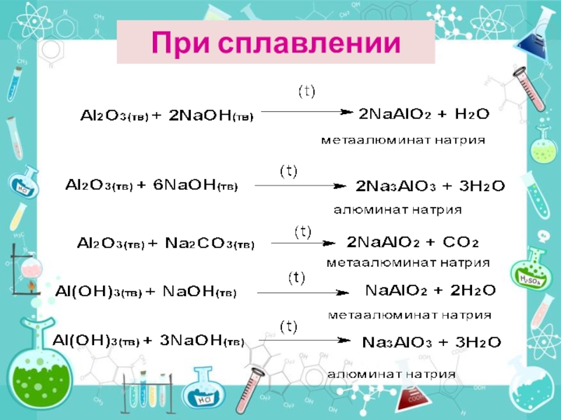 При взаимодействии с растворами щелочей (взятыми в избытке) образуют алюминаты, т.е. соли, в которых алюминий входит в состав аниона.