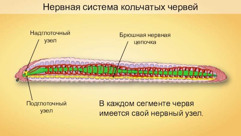 Нервная система кольчатых червейНадглоточный узелПодглоточный узелБрюшная нервная цепочкаВ каждом сегменте червя имеется свой нервный узел.