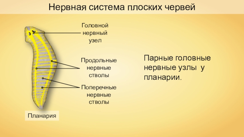 ПланарияНервная система плоских червей Головной нервный узелПродольные нервные стволыПоперечные нервные стволыПарные головные нервные узлы у планарии.