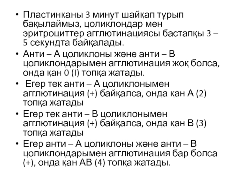 Слайд 10Пластинканы 3 минут шайқап тұрып бақылаймыз, цоликлондар мен эритроциттер агглютинациясы