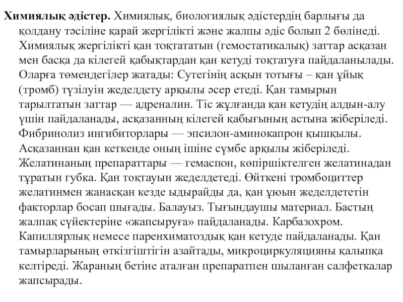 Өйткені бұл тіндер тромбопластинге бай тіндер. Биологиялық табиғатты заттарды пайдалану. Әдетте, гомо- гетерогендік плазманы пайдаланады. Кейде плазмға коллагенді қосады. Негізгі препараттары: Тромбин — тек қана жергілікті түрде қолданылады. Ұнтақ, ерітінді түрінде пайдаланады және басқа гемостатикалық заттардың құрамына кіреді. Асқазаннан қан кеткенде басқа заттарға қосып пайдаланылады (сүмбе арқылы тромбин, ЭАКҚ, фибриногеннен тұратын салқындатылған қоспа жіберіледі). Фибриноген — таза күйінде гемостатикалық зат ретінде қолданылмайды. Тромбинмен бірге жергілікті гемостатикалық заттар мен фибрин клейінің құрамына кіреді. 3 Гемостатикалық губка — лиофилизация жасалған плазмадан тұрады. Кейбір түрлерінің құрамына тромбин, Са иондары, антисептиктер кіреді. Гемостатикалық белсенділігі жоғары.