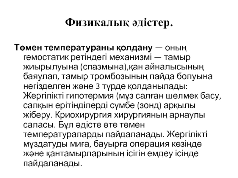 Слайд 25Жоғары температура әсерін қолдану. Жоғары температураның гемостатикалық әсерінің механизмі —