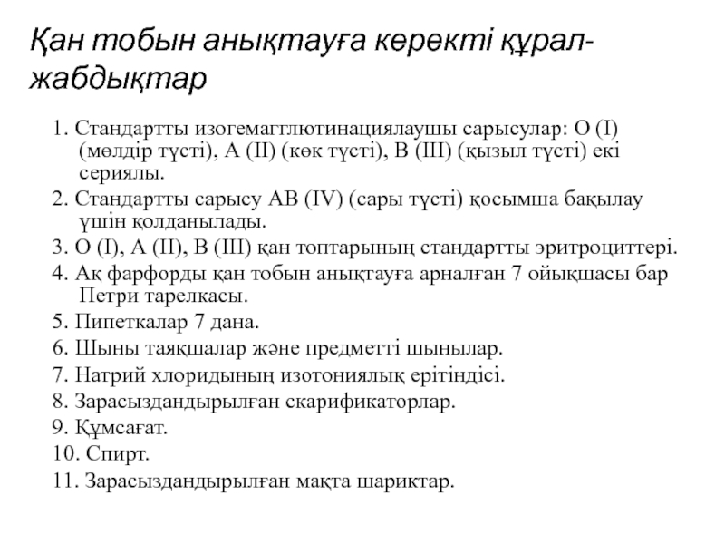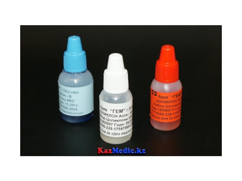 Слайд 41. Стандартты изогемагглютинациялаушы сарысулар: О (І) (мөлдір түсті), А (ІІ)