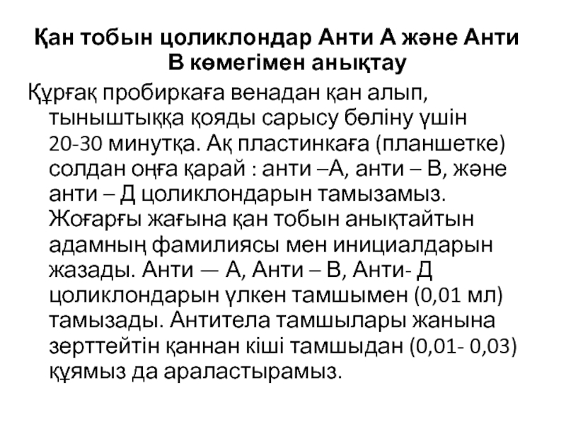 20-30 минутқа. Ақ пластинкаға (планшетке) солдан оңға қарай : анти –А, анти – В, және анти – Д цоликлондарын тамызамыз. Жоғарғы жағына қан тобын анықтайтын адамның фамилиясы мен инициалдарын жазады. Анти — А, Анти – В, Анти- Д цоликлондарын үлкен тамшымен (0,01 мл) тамызады. Антитела тамшылары жанына зерттейтін қаннан кіші тамшыдан (0,01- 0,03) құямыз да араластырамыз.