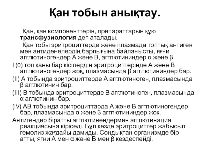 Слайд 1Қан тобын анықтау.Резус фактор анықтау,қан тобының сәйкестігін анықтау.Қан құю техникасы