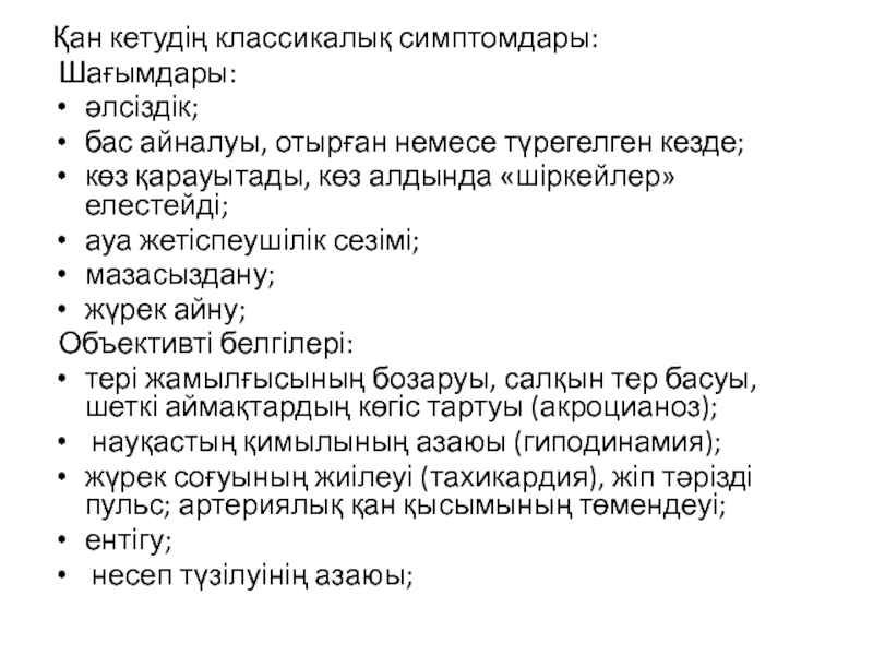 Слайд 32Қан кетудің классикалық симптомдары: