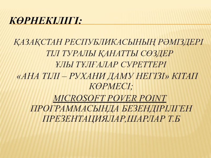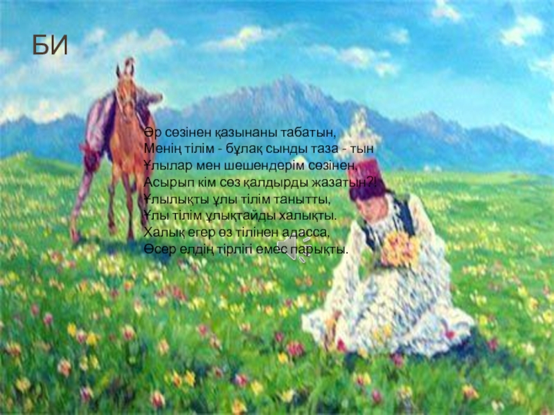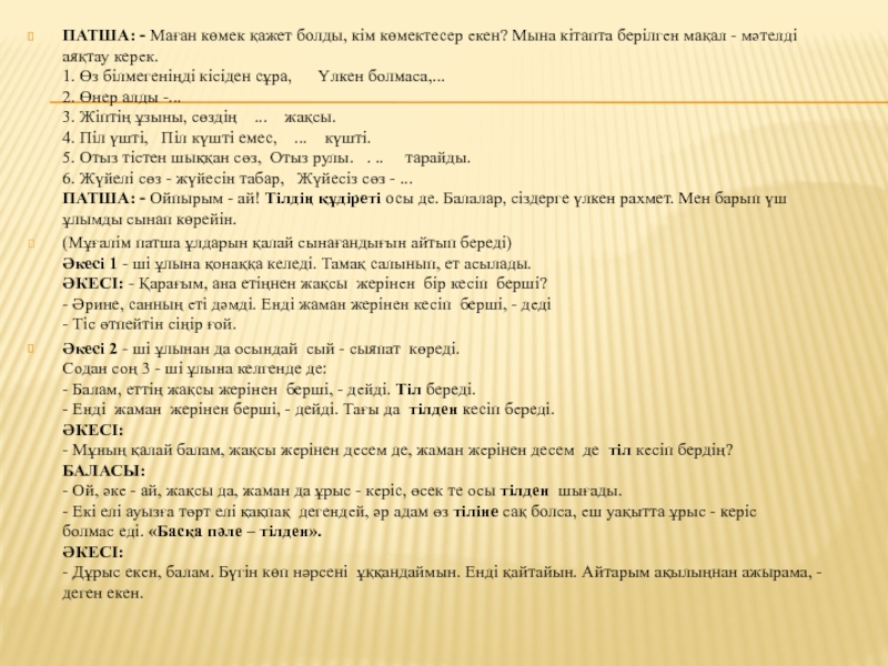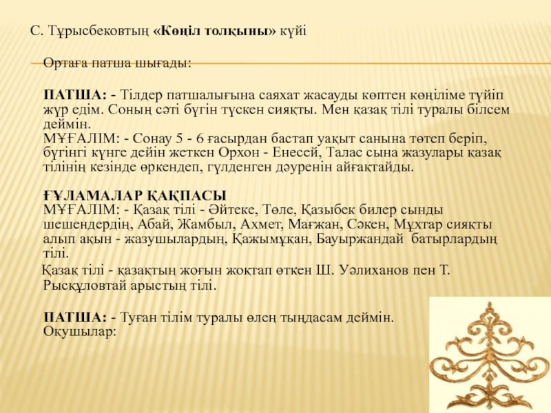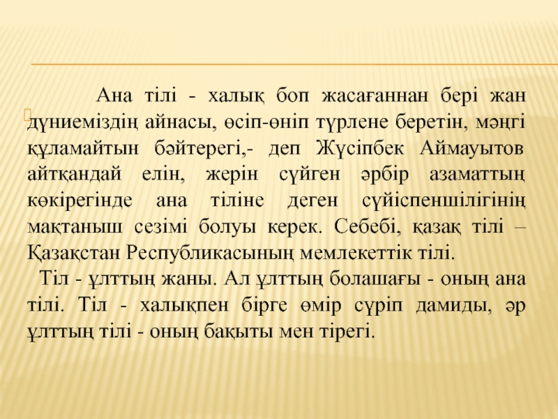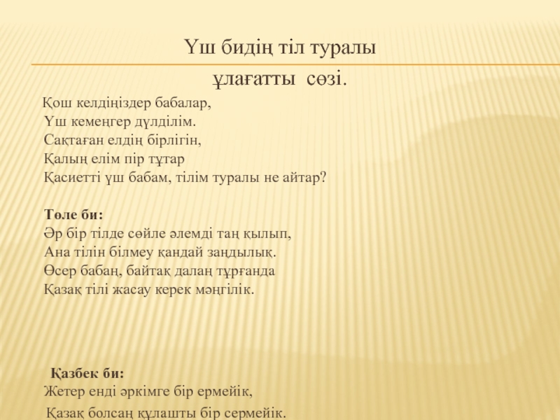 МҰҒАЛІМ: - Қазақ тілі - Әйтеке, Төле, Қазыбек билер сынды шешендердің, Абай, Жамбыл, Ахмет, Мағжан, Сәкен, Мұхтар сияқты алып ақын - жазушылардың, Қажымұқан, Бауыржандай батырлардың тілі.