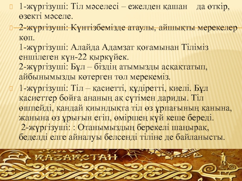2-жүргізуші: : Отанымыздың берекелі шаңырақ, беделді елге айналуы белсенді тіліне де байланысты.