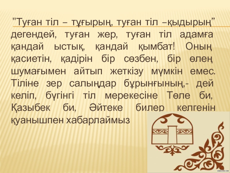 қасиетін, қадірін бір сөзбен, бір өлең шумағымен айтып жеткізу мүмкін емес.Тіліне зер салыңдар бұрынғының,- дей келіп, бүгінгі тіл мерекесіне Төле би, Қазыбек би, Әйтеке билер келгенін қуанышпен хабарлаймыз