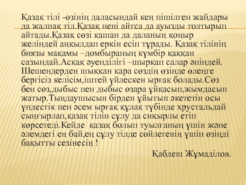 Слайд 16 Қазақ тілі -өзінің даласындай кең пішілген жайдары да