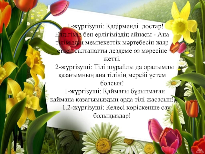 2-жүргізуші: Тілі шұрайлы да оралымды қазағымның ана тілінің мерейі үстем болсын!