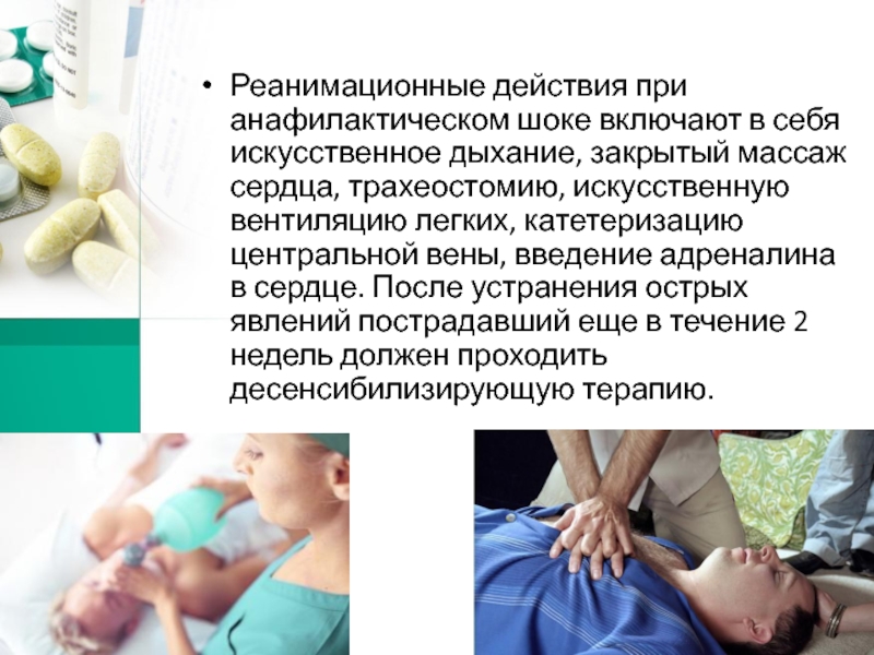 Слайд 16Реанимационные действия при анафилактическом шоке включают в себя искусственное дыхание,