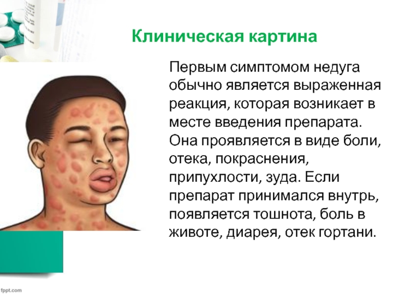 отека, покраснения, припухлости, зуда. Если препарат принимался внутрь, появляется тошнота, боль в животе, диарея, отек гортани.