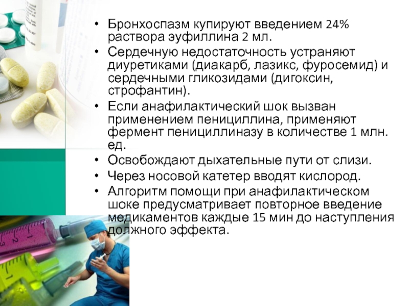 Слайд 15Бронхоспазм купируют введением 24% раствора эуфиллина 2 мл.