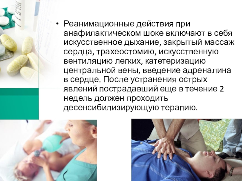Слайд 16Реанимационные действия при анафилактическом шоке включают в себя искусственное дыхание,