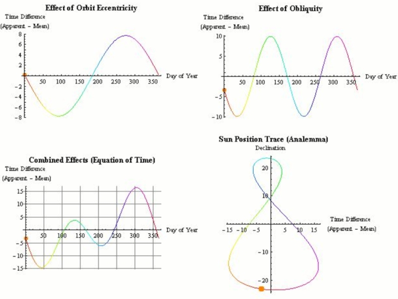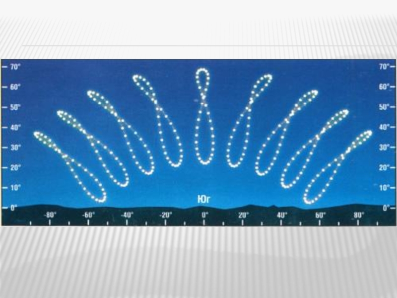 Если изобразить склонение Солнца (угол, на который Солнце отклоняется от небесного экватора) в зависимости от уравнения времени в каждый день года, мы получим кривую в виде восьмерки, называемую аналеммой. В силу
