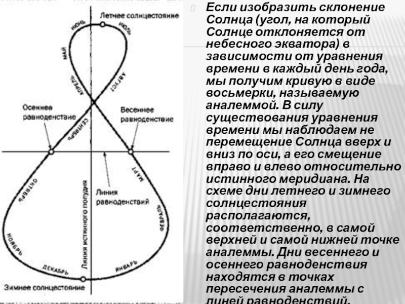года, мы получим кривую в виде восьмерки, называемую аналеммой. В силу существования уравнения времени мы наблюдаем не перемещение Солнца вверх и вниз по оси, а его смещение вправо и влево относительно истинного меридиана. На схеме дни летнего и зимнего солнцестояния располагаются, соответственно, в самой верхней и самой нижней точке аналеммы. Дни весеннего и осеннего равноденствия находятся в точках пересечения аналеммы с линей равноденствий.