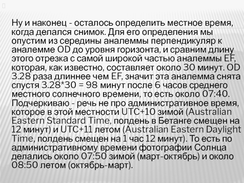 к аналемме OD до уровня горизонта, и сравним длину этого отрезка с самой широкой частью аналеммы EF, которая, как известно, составляет около 30 минут. OD 3.28 раза длиннее чем EF, значит эта аналемма снята спустя 3.28*30 = 98 минут после 6 часов среднего местного солнечного времени, то есть около 07:40. Подчеркиваю - речь не про административное время, которое в этой местности UTC+10 зимой (Australian Eastern Standard Time, полдень в Бетанге смещен на 12 минут) и UTC+11 летом (Australian Eastern Daylight Time, полдень смещен на 1 час 12 минут). То есть по административному времени фотографии Солнца делались около 07:50 зимой (март-октябрь) и около 08:50 летом (октябрь-март).