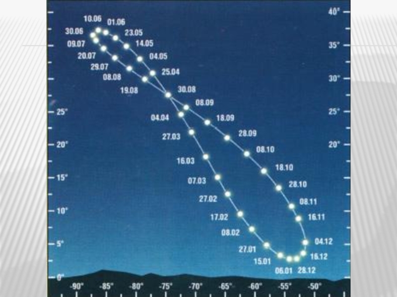 медленно меняются из-за прецессии земной оси (ось Земли описывает конус за период около 26 тысяч лет). Какие координаты (α, δ) будет иметь эта звезда через 6500 лет?