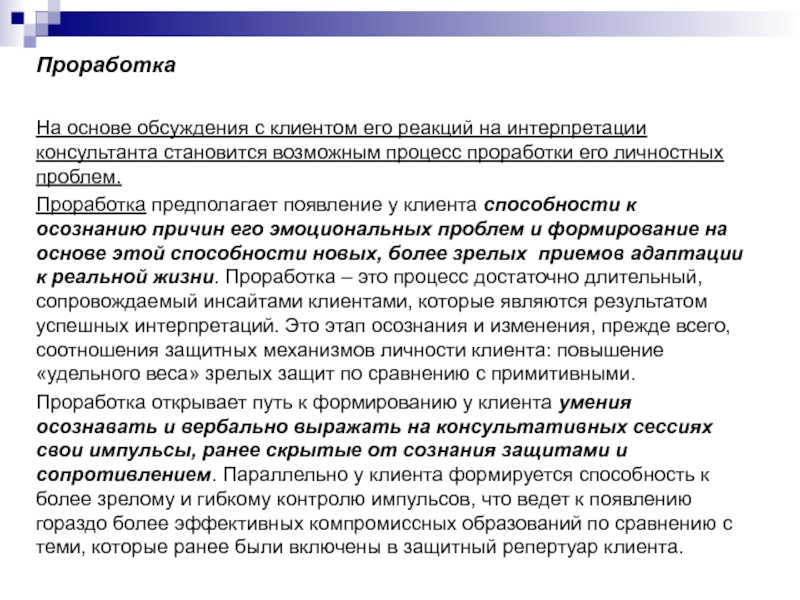 Проработка открывает путь к формированию у клиента умения осознавать и вербально выражать на консультативных сессиях свои импульсы, ранее скрытые от сознания защитами и сопротивлением. Параллельно у клиента формируется способность к более зрелому и гибкому контролю импульсов, что ведет к появлению гораздо более эффективных компромиссных образований по сравнению с теми, которые ранее были включены в защитный репертуар клиента.