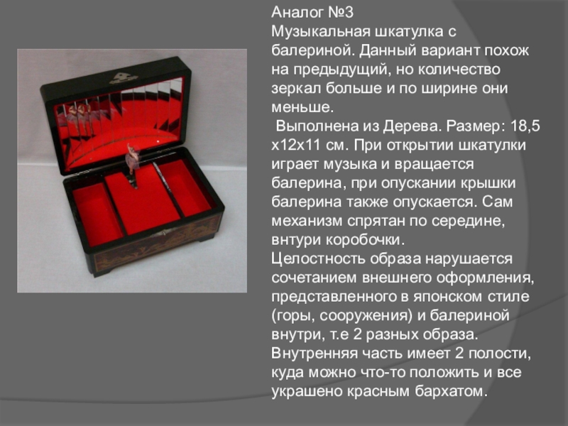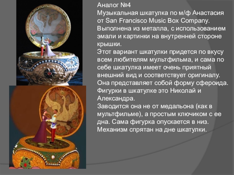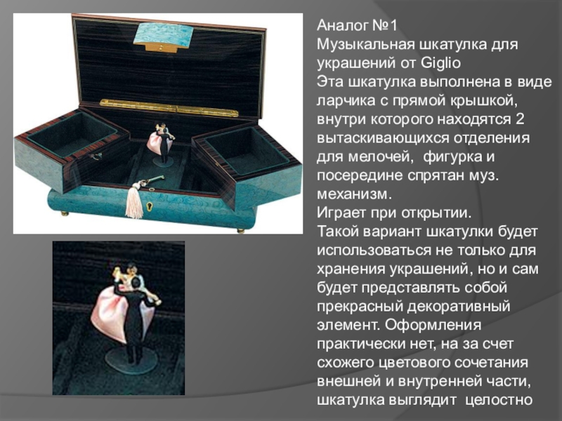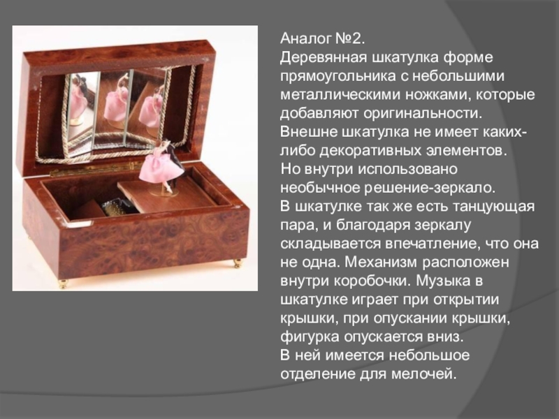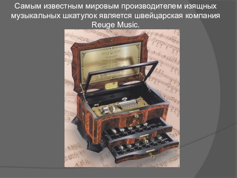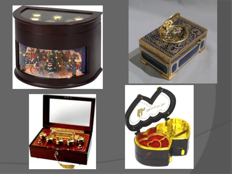 карман, до предметов мебели. Но чаще всего музыкальные шкатулки размещаются на столе или серванте.Устройство музыкальной - цилиндр со штырьками, станина, на которую установлены все детали, плоская гребенка и рукоятка. Хотя устройство более сложных музыкальных шкатулок включает в себя еще и колокольчики, а также барабан.
