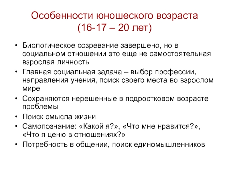 Слайд 12Особенности юношеского возраста (16-17 – 20 лет)
