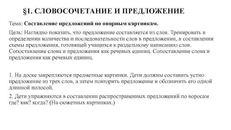 количества и последовательности слов в предложении, в составлении схемы предложения, готовящей учащихся к раздельному написанию слов. Сопоставление слова и предложения как речевых единиц. Сопоставление слова и предложения как речевых единиц.