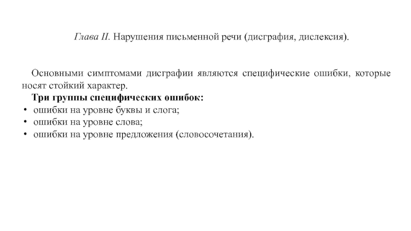 Слайд 7Глава ΙΙ. Нарушения письменной речи (дисграфия, дислексия).