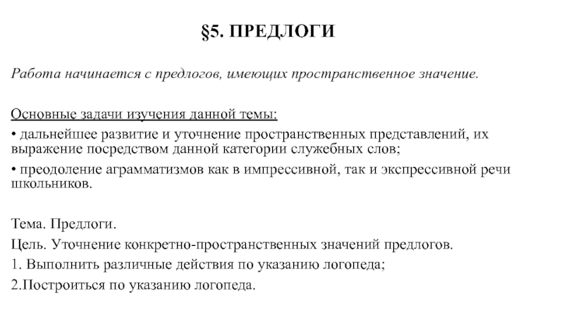 • дальнейшее развитие и уточнение пространственных представлений, их выражение посредством данной категории служебных слов;