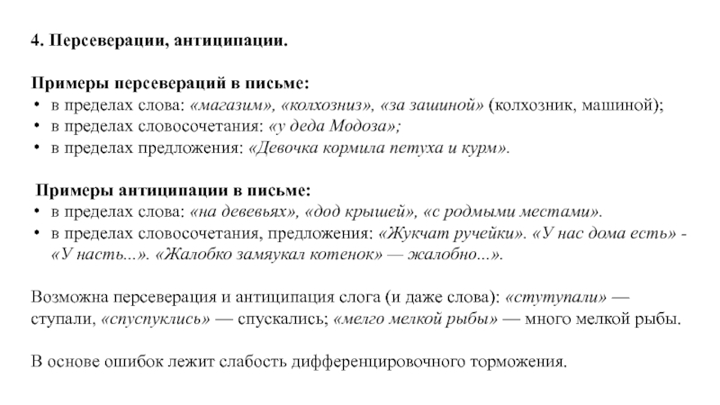 Возможна персеверация и антиципация слога (и даже слова): «стутупали» — ступали, «спуспуклись» — спускались; «мелго мелкой рыбы» — много мелкой рыбы.