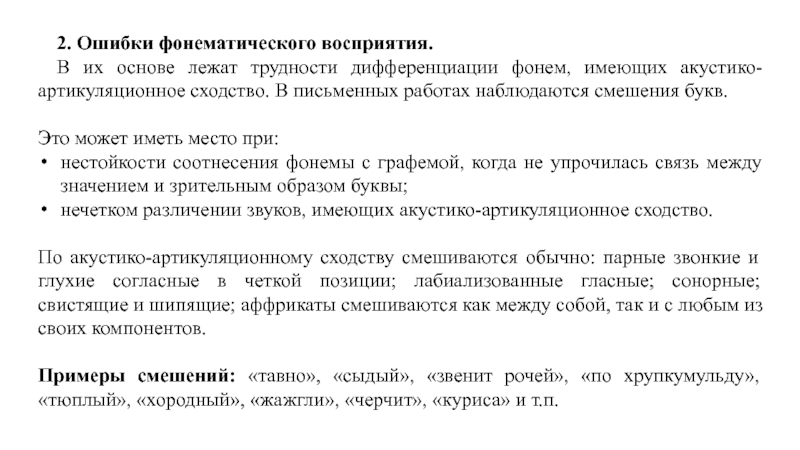 фонем, имеющих акустико-артикуляционное сходство. В письменных работах наблюдаются смешения букв.