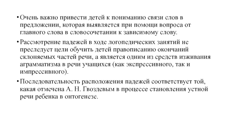 Последовательность расположения падежей соответствует той, какая отмечена А. Н. Гвоздевым в процессе становления устной речи ребенка в онтогенезе.