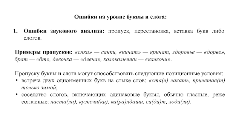 Пропуску буквы и слога могут способствовать следующие позиционные условия: