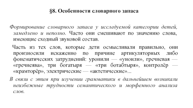 Примеры ошибок: лед — «ледик», мед — «медик», рука — «рукища», нога — «ногища», «взмахнул лопатый», «глубокие скважинные».
