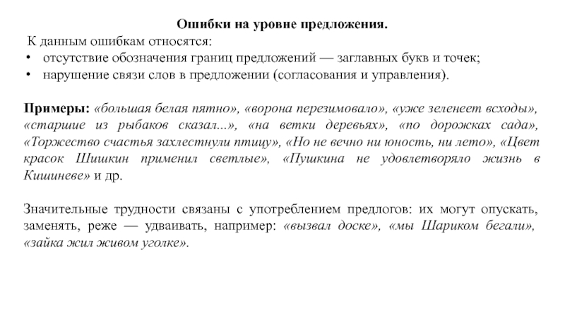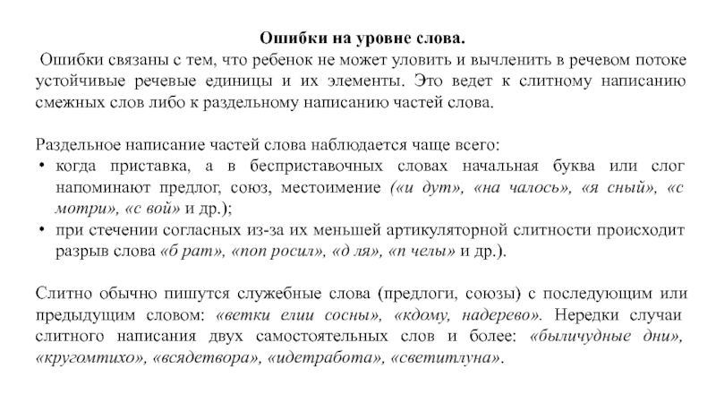 К ошибкам на уровне слова относится морфемный аграмматизм, который является отражением в письме трудностей анализа и синтеза частей слов. Ошибки обнаруживаются в операции словообразования.