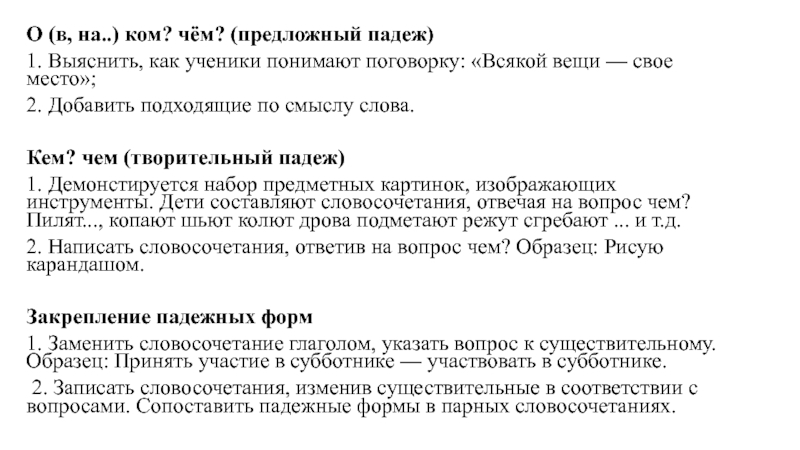 1. Демонстируется набор предметных картинок, изображающих инструменты. Дети составляют словосочетания, отвечая на вопрос чем? Пилят..., копают шьют колют дрова подметают режут сгребают ... и т.д.