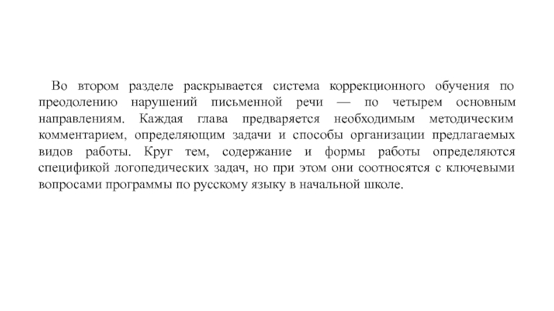Слайд 4Во втором разделе раскрывается система коррекционного обучения по преодолению нарушений