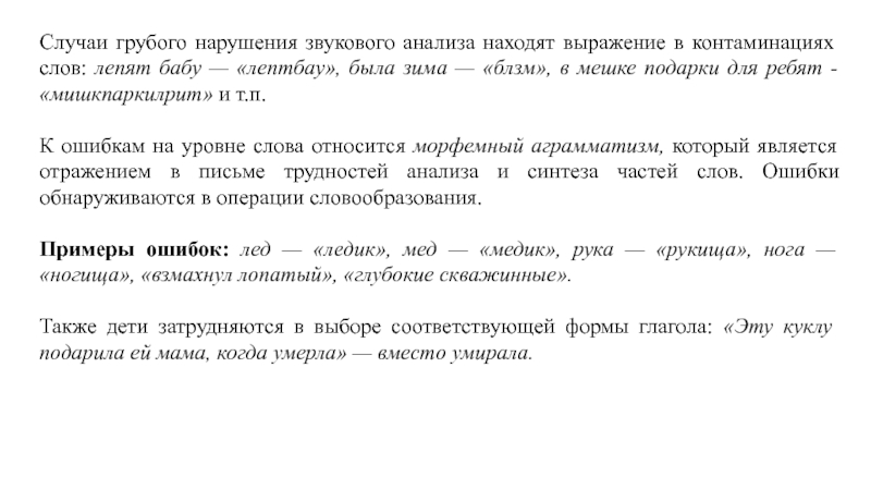 Слайд 14Случаи грубого нарушения звукового анализа находят выражение в контаминациях слов: