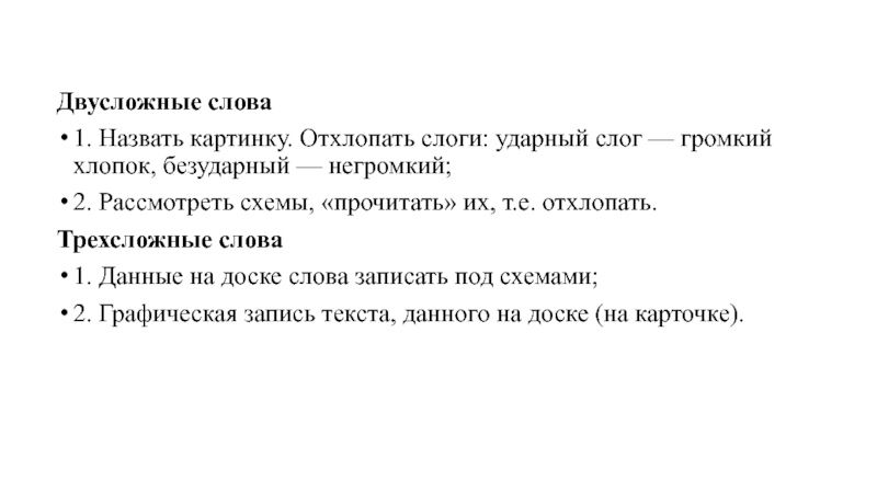 1. На доске закрепляются предметные картинки. Дети должны составить устно предложение из трех слов, а затем повторить предложение и обозначить его одной длинной полосой.