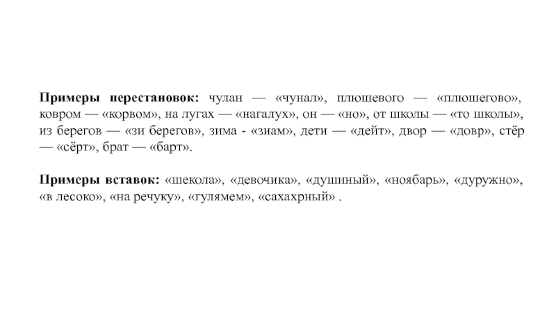Слайд 9Примеры перестановок: чулан — «чунал», плюшевого — «плюшегово», ковром —