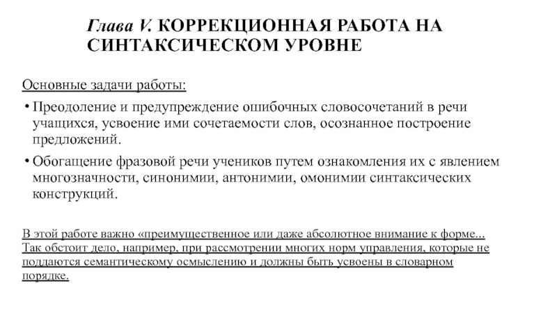 Слайд 63Глава V. КОРРЕКЦИОННАЯ РАБОТА НА СИНТАКСИЧЕСКОМ УРОВНЕ