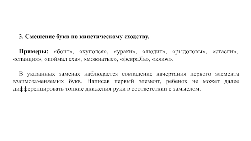 наблюдается совпадение начертания первого элемента взаимозаменяемых букв. Написав первый элемент, ребенок не может далее дифференцировать тонкие движения руки в соответствии с замыслом.