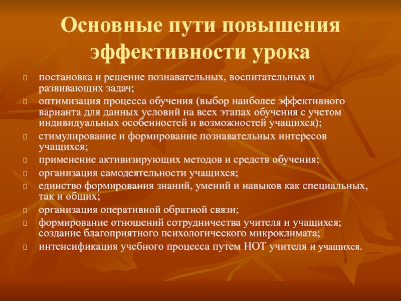 интенсификация учебного процесса путем НОТ учителя и учащихся.