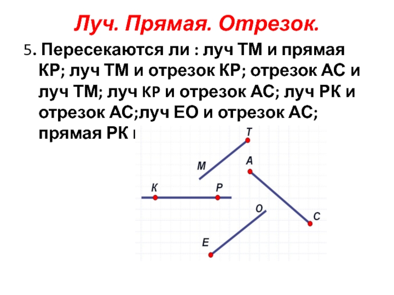 ТМ; луч KP и отрезок АС; луч РК и отрезок АС;луч ЕО и отрезок АС; прямая РК и отрезок АС.