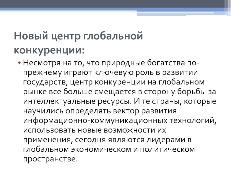 рынке все больше смещается в сторону борьбы за интеллектуальные ресурсы. И те страны, которые научились определять вектор развития информационно-коммуникационных технологий, использовать новые возможности их применения, сегодня являются лидерами в глобальном экономическом и политическом пространстве.
