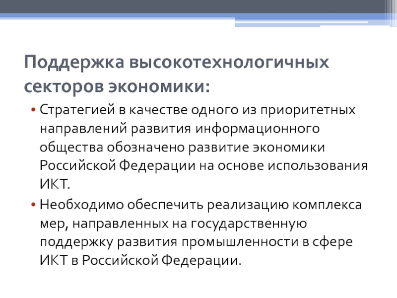 Слайд 9Поддержка высокотехнологичных секторов экономики: