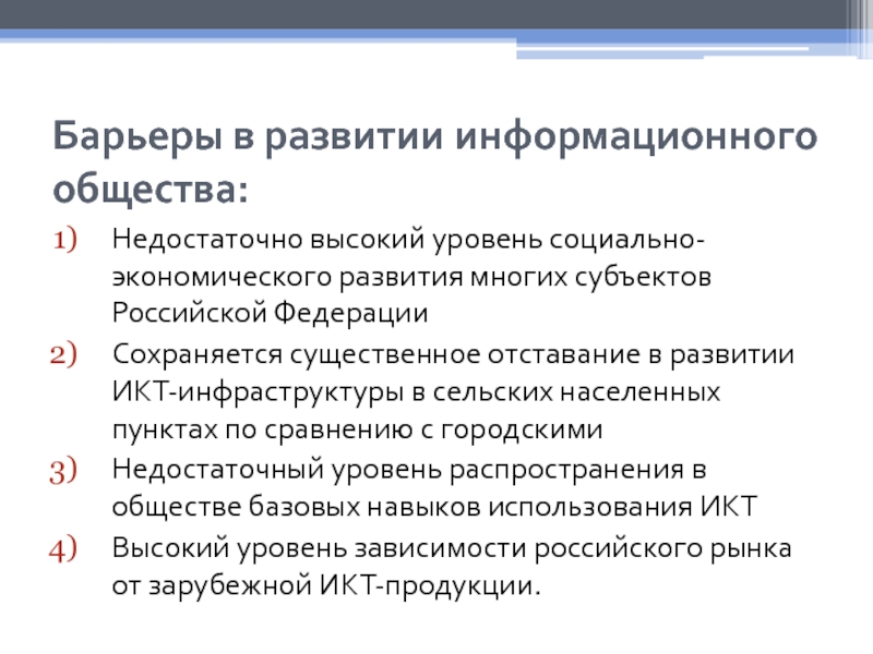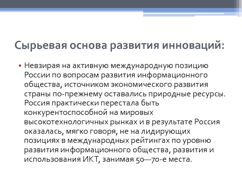 оставались природные ресурсы. Россия практически перестала быть конкурентоспособной на мировых высокотехнологичных рынках и в результате Россия оказалась, мягко говоря, не на лидирующих позициях в международных рейтингах по уровню развития информационного общества, развития и использования ИКТ, занимая 50—70-е места.