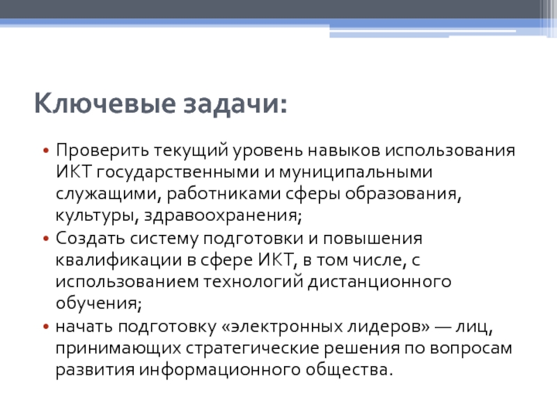 начать подготовку «электронных лидеров» — лиц, принимающих стратегические решения по вопросам развития информационного общества.