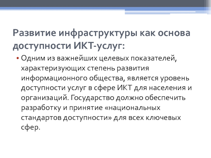 в сфере ИКТ для населения и организаций. Государство должно обеспечить разработку и принятие «национальных стандартов доступности» для всех ключевых сфер.